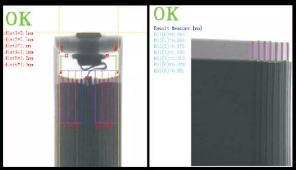 ▲鋁殼電池頭部極耳內部結構和正負極片對齊度檢測