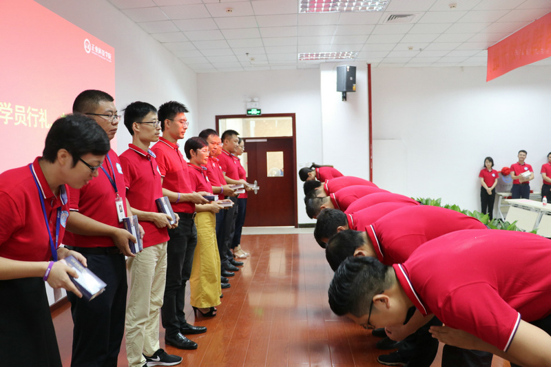 開班儀式上舉行了莊嚴的拜師儀式,42位儲備高管分別給老師們行拱手禮,感謝老師們的悉心栽培,從此發奮圖強,為公司的事業再創輝煌,老師們贈書給學員作為回贈。