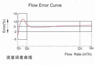 b、從包括分界流量(Q2)在內(nèi)到包括過載流量(Q4)的高區(qū)中的更大允許誤差是±2%